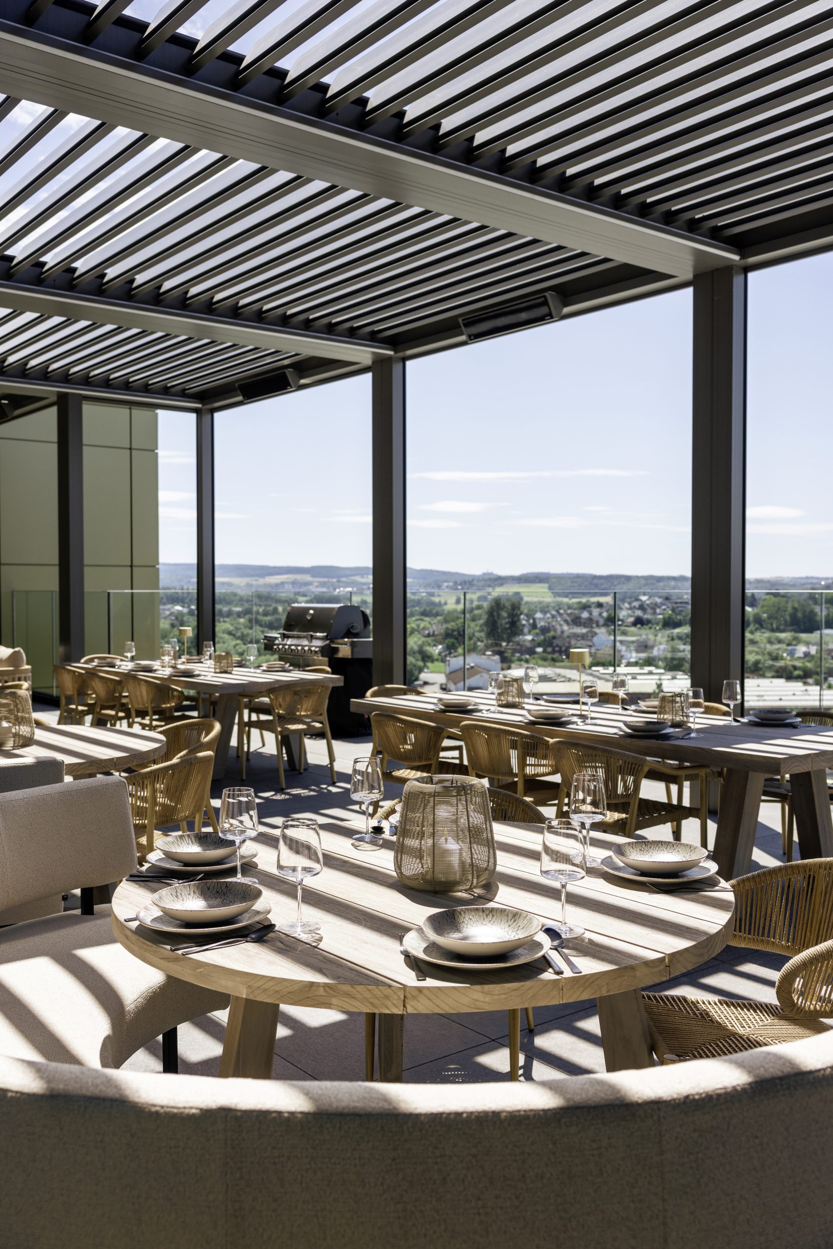 Realisierung einer großzügigen Lamellendachkonstruktion aus mehreren Warema Lamaxa L70 Anlagen.